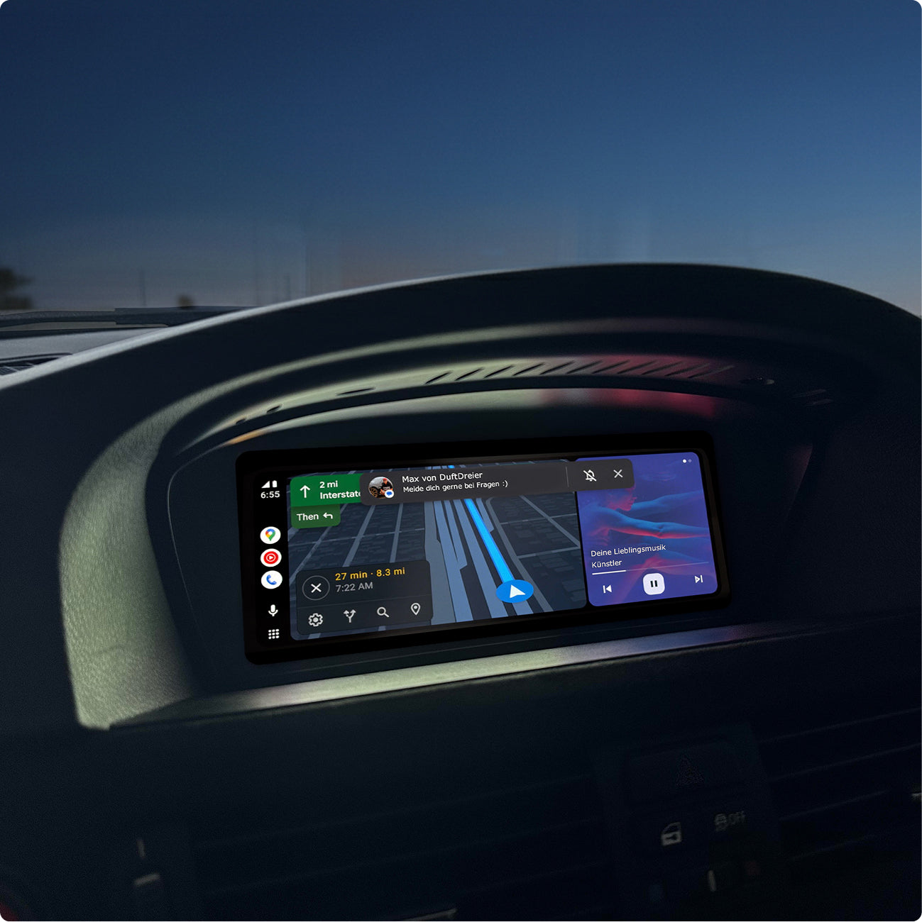 Auch nach der Nachrüstung mit dem DuftDreier CarPlay-System kannst du dein Head-Up Display wie gewohnt verwenden. Bitte beachte: Die Routenführung von Apps wie Google Maps oder Apple Karten wird nicht im Head-Up Display angezeigt, sondern auf dem Display des Fahrzeugs.